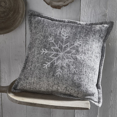 Ce joli coussin est confectionné avec un tissu chiné gris et blanc, brodé d’un flocon de neige