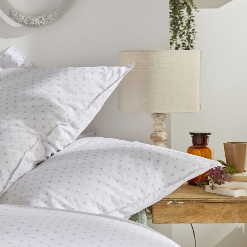 Cette jolie parure motif gris perle avec des gros coeurs imprimés comprend : 1 housse de couette en 240cm x 220cm avec 2 taies 63cm x 63cm