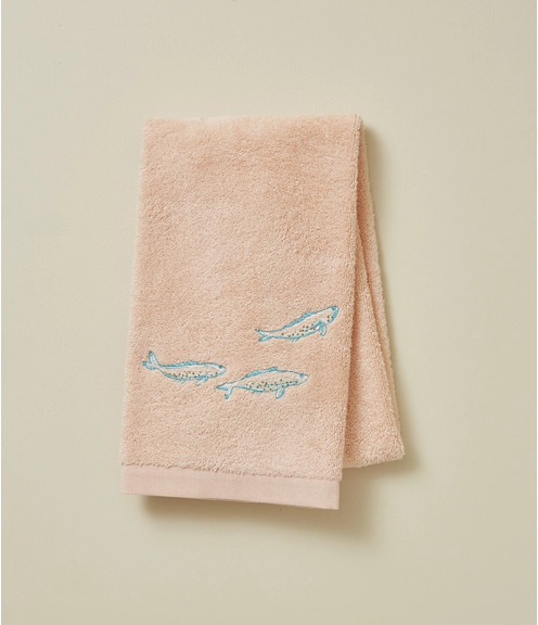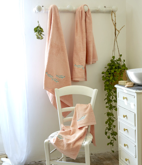Jolie collection sur une éponge qualité 550gr/m2 – couleur rose saumonée, avec broderie de poissons