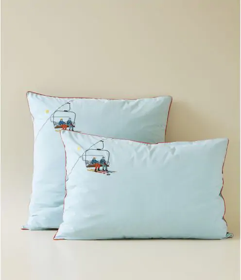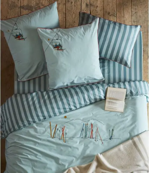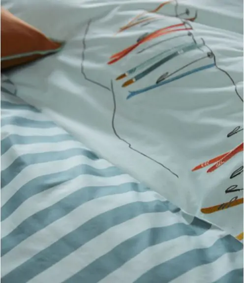 Comme une belle journée passée sur les pistes, des skis colorés se dessinent sur la housse de couette, contrastant avec la fraîcheur d’un fond bleu givré.