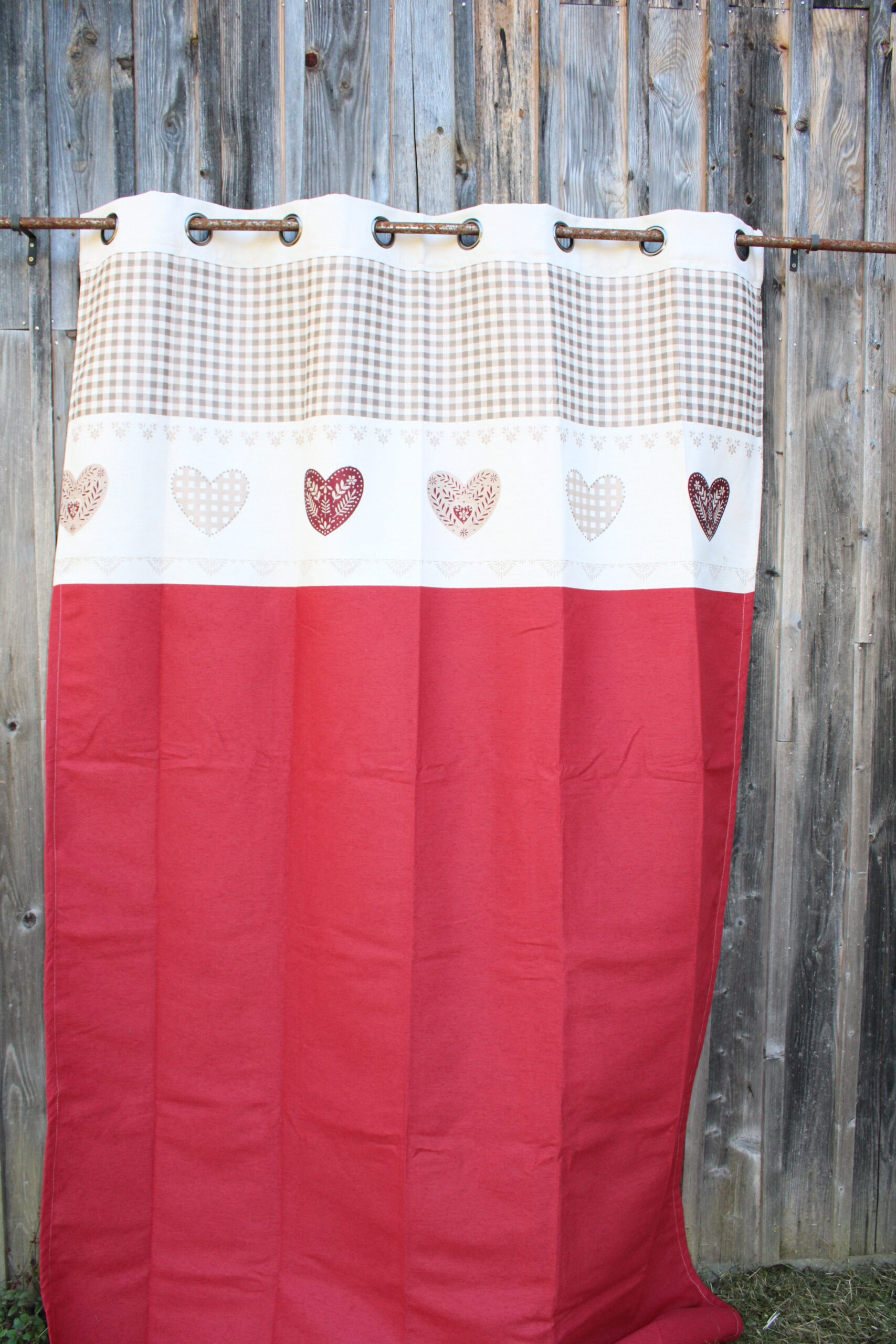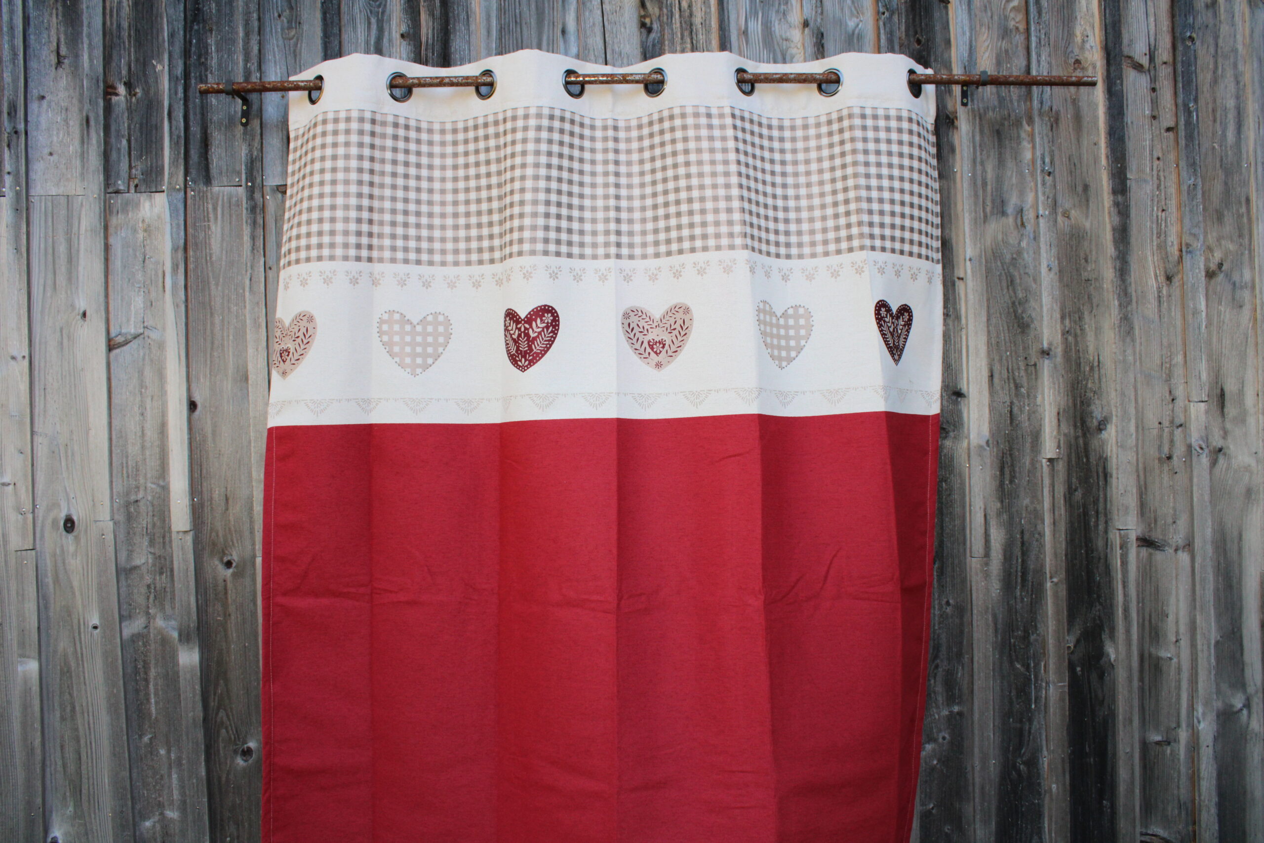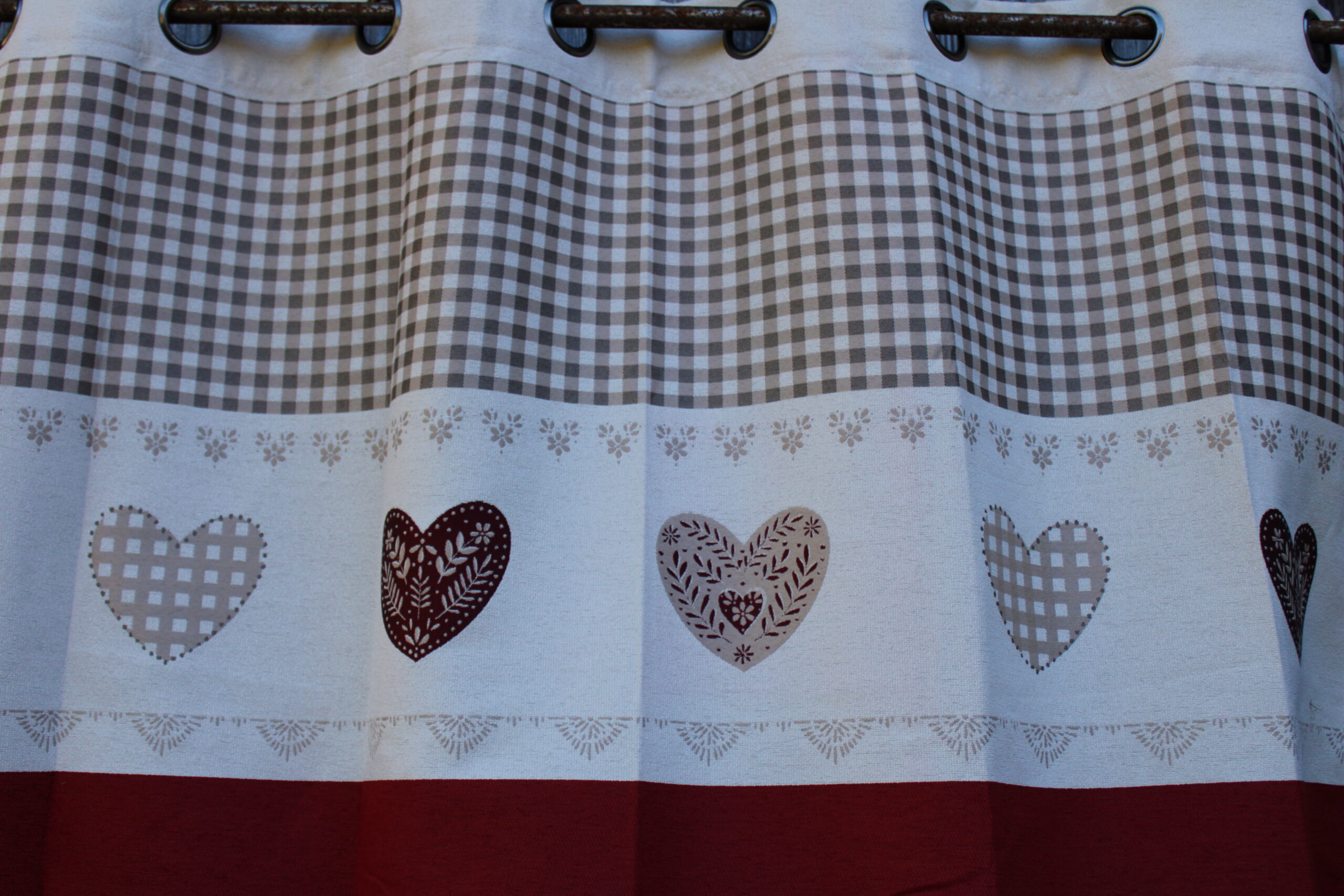 Ce joli rideau est de couleur rouge, avec des coeurs taupe,